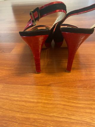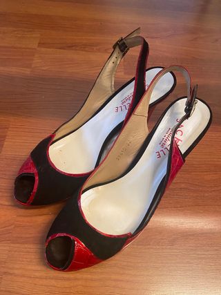 Elegantes zapatos de tacón con un diseño sofisticado. - Combinación de piel roja y ante negro. - Tira trasera ajustable con hebilla. - Punta abierta. - Detalle de textura en la piel roja.
