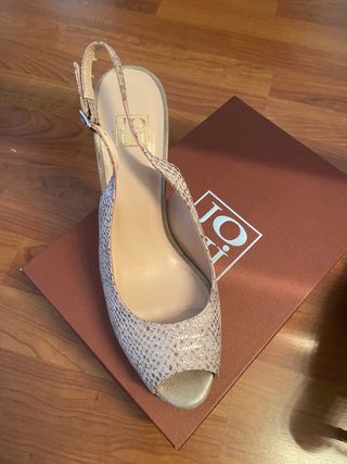 Elegantes zapatos de tacón marca Joni con un diseño peep toe. - Acabado texturizado imitando piel de serpiente. - Tira ajustable en el talón. - Detalle metálico en la puntera.