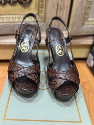 sandalias ash marrones de piel con efecto piel de serpiente, valen 37 y 38, ya que la tira que llevan detrás lleva goma. Tienen una plataforma anterior que hace que sea muy cómodo, solo se han puesto para estar por casa, son nuevas 70 €