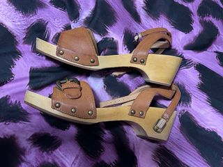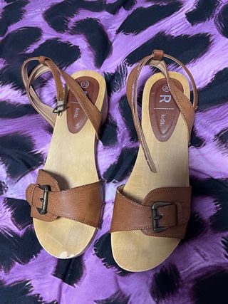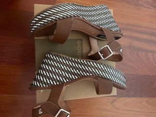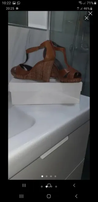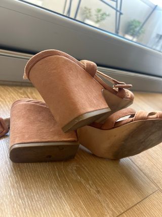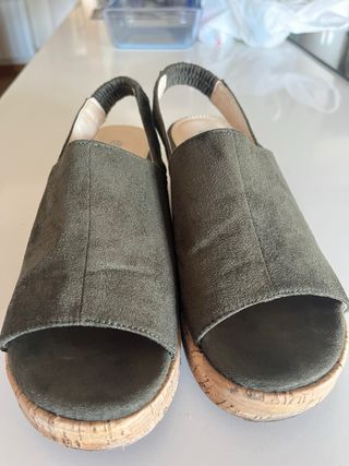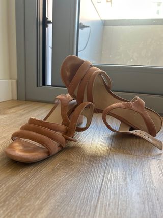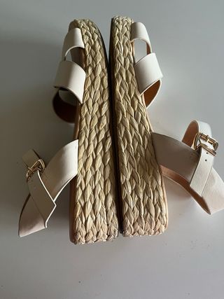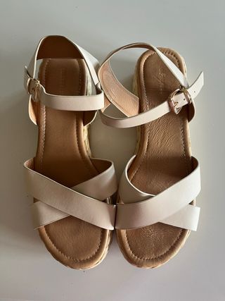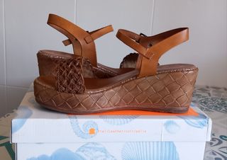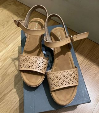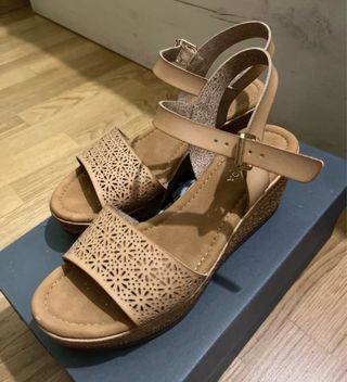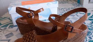 Usadas una vez. Tienen su 📦. Sandalias tipo cuña en color avellana.