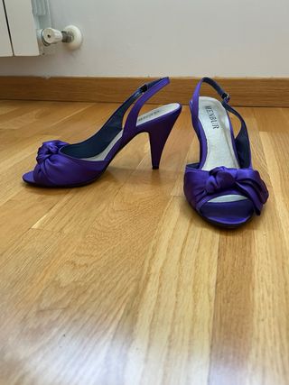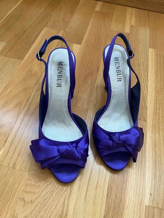 Sandalias de tacón fino de la marca Menbur, color morado satinado, con elegante lazo frontal. Tienen tacón de 8 cm (ver foto) y cierre con hebilla. Muy cómodas y ligeras. Ideales para eventos, bodas o fiestas. Talla 38. Están en muy buen estado, usadas solo una vez (ver suelas). Perfectas para dar un toque de color y elegancia a cualquier look.