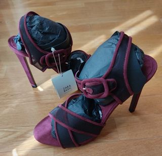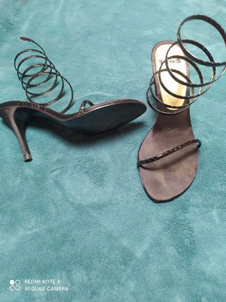 Sandalias con tacon de aguja en seda y sujetas en espiral de charol. Usadas una sola vez.