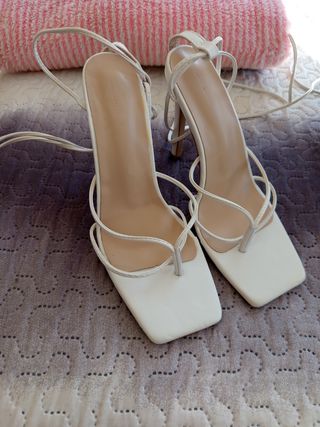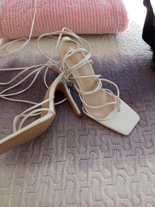 Preciosas sandalias blancas de tacón alto. Ideales para ocasiones especiales. - Diseño de tiras que se atan ala pierna. - Tacón fino y elegante. - Color blanco impoluto. - Número 40..las pedí en shein y me llegó mal el número...sin estrenar ..de SHEIN