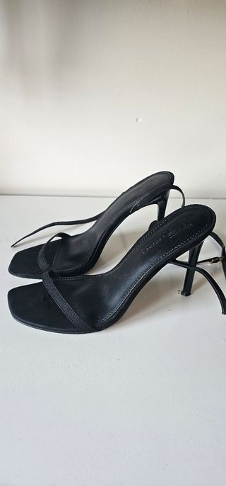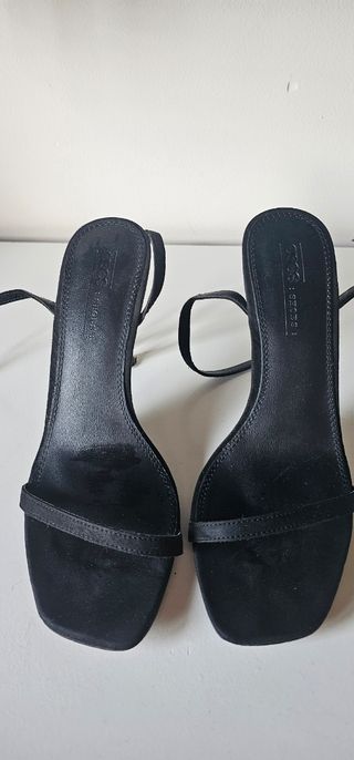 Sandalias de tacón de la marca ASOS, en color negro. Son elegantes y estilizadas. - Tacón fino. - Diseño minimalista. - Material: ante sintético. Tacón de unos 10'5 cm