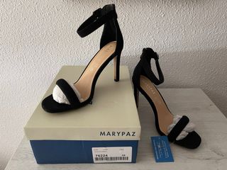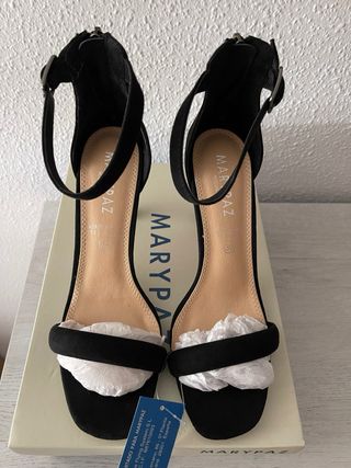 Sandalias de tacón de ante negras de la marca MARYPAZ. Son talla 39. - Elegante diseño de tiras. - Altura del tacón ideal para cualquier ocasión. (10 cm)- En perfecto estado, sin usar. - Se venden en su caja original.
