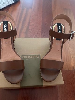 Sandalias Gioseppo de mujer, color marrón. Son preciosas y elegantes. - Cuña de esparto con diseño geométrico. - Hebilla de cierre en el tobillo. - Perfectas para cualquier ocasión.