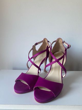 Preciosas sandalias de tacón de la marca Gloria Ortiz. Ideales para una ocasión especial. - Son de color fucsia. - Material de satén. - Diseño de tiras cruzadas. - Cierre de hebilla en el tobillo. - Tacón fino y elegante. - Usadas una sola vez.