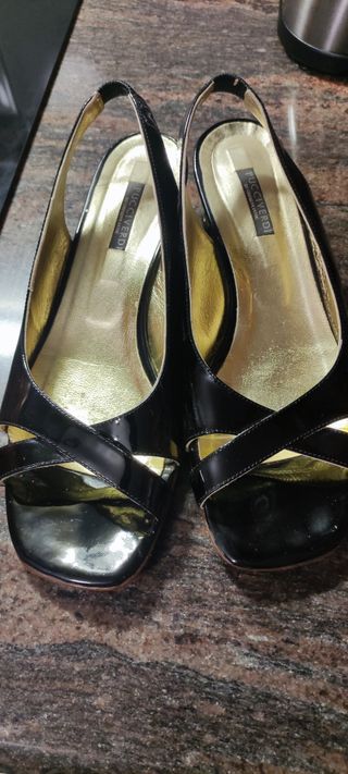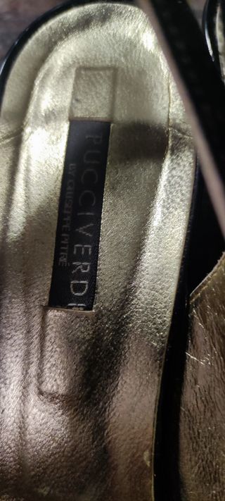 Elegante par de sandalias de tacón de la marca Pucci Verdi. Son de charol negro y tienen un diseño cruzado. Ideales para ocasiones especiales. -Elaboradas en charol brillante. -Diseño de tiras cruzadas. -Tacón bajo. Pequeñas marcas en los tacones, que no se ven desde arriba