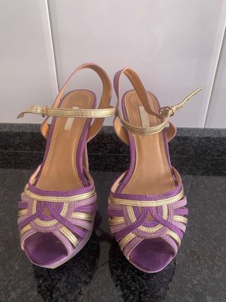 Elegantes sandalias de tacón con un diseño de tiras cruzadas. - Tiras en color morado y detalles dorados. - Cierre de hebilla en la correa del tobillo.