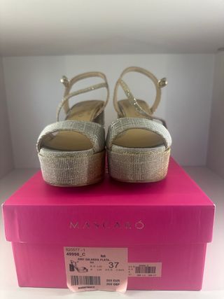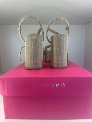 Elegantes sandalias de la marca Mascaró con un diseño brillante que las hace perfectas para ocasiones especiales. La plataforma añade altura y comodidad. Están perfectas, usadas en una ocasión. Caja Original - Diseño con tiras y cierre de hebilla. - Acabado metalizado. - Plataforma gruesa 4 cm - Tacón 9cm