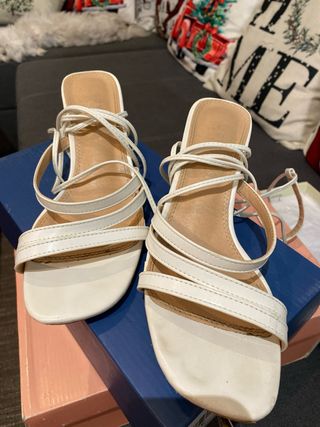 Sandalias de tacón en color blanco. - Diseño de tiras finas - Cierre con pulsera al tobillo. - Tacón de aguja Solo se ha usado una vez para una boda, les falta una pequeña limpieza.