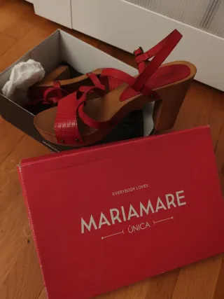 Sandalias de tacón con un diseño elegante y moderno. - Tiras rojas con textura. - Tacón de madera. - Cierre de hebilla.