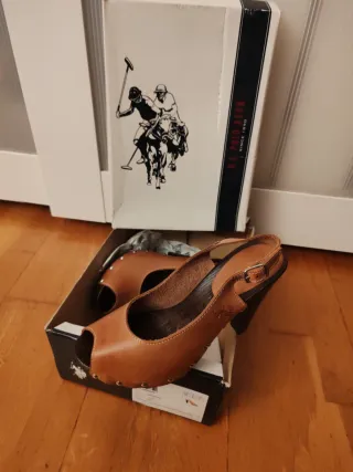 Elegantes sandalias de cuero para mujer. - Diseño de tiras cruzadas. - Tacón fino y moderno. - Cierre con hebilla. - Punta cuadrada. - Totalmente nueva.