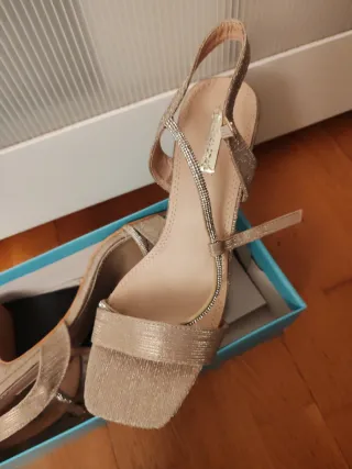 Elegantes sandalias de tacón con plataforma. - Diseño metálico brillante. - Tira ajustable al tobillo con hebilla. - Tacón grueso y cuadrado. - Altura del tacón 9cm con una plataforma de 3cm por lo que tiene una altura real de 6cm
