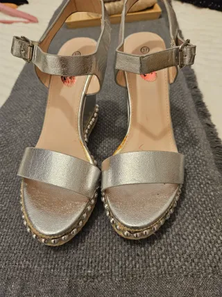 Sandalias de cuña en color plateado, perfectas para añadir un toque de brillo a tus looks. - Diseño con tiras y cierre de hebilla. - Adorno de tachuelas en la suela. - Material exterior efecto piel.