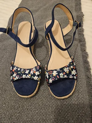 Sandalias de cuña con un diseño floral alegre y tiras en azul marino. - Diseño de cuña con esparto. - Tira ajustable al tobillo. - Estampado floral en la pala.