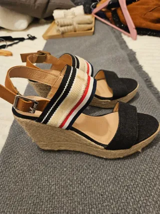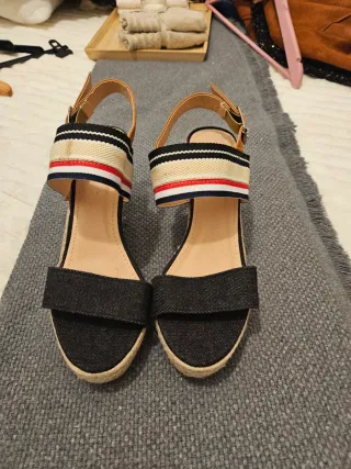 Sandalias de cuña con un diseño moderno y llamativo. - Tira delantera en tejido vaquero negro. - Tira en el tobillo con estampado de rayas multicolor. - Suela de esparto. - Cierre de hebilla ajustable.