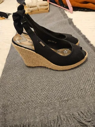 Sandalias de cuña de la marca Bossanova en color negro. - Cierre con hebilla. - Diseño peep toe. - Plataforma forrada de esparto.