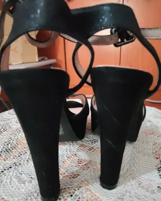 Elegantes sandalias negras, perfectas para ocasiones especiales. Han sido usadas una sola vez. - Diseño con tiras cruzadas. - Tacón alto. - Acabado brillante.