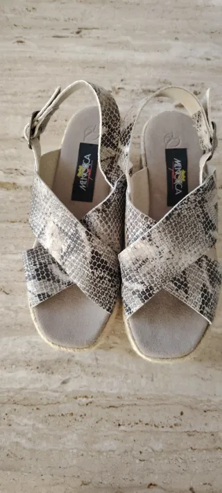 Sandalias de cuña con diseño de serpiente. - Tiras cruzadas. - Cierre de hebilla. - Suela de esparto. - Altura 7cm con una plataforma de 4,5cm