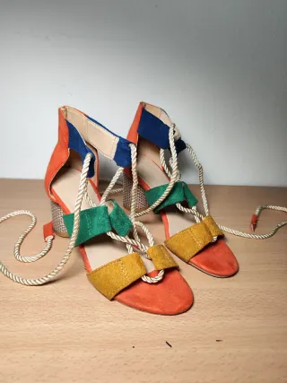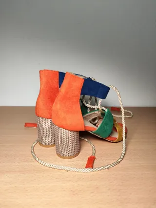 Sandalias de mujer con un diseño vibrante y atrevido. - Combinación de colores naranja, amarillo y verde. - Tiras de amarre con cordón dorado. - Tacón con textura tejida.