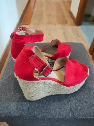 Sandalias de cuña Forever 21 en color rojo, modernas y muy cómodas para el día a día o para vestir en verano. Cuña de esparto estilo alpargata que resulta estable y fácil de llevar. Cierre con pulsera ajustable al tobillo para mayor sujeción. Color rojo muy bonito que destaca y combina muy bien con ropa de verano. En buen estado general aunque con alguna pequeña mancha por el uso en la zona de los dedos. Listas para usar.