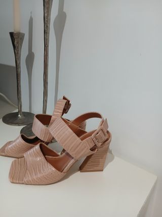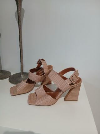 Sandalias de tacón de Zara con tiras transparentes y tacón de bloque. - Diseño moderno y elegante. - Tacón con acabado plateado. - Cierre de tira al tobillo.