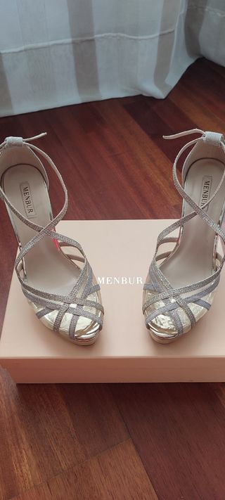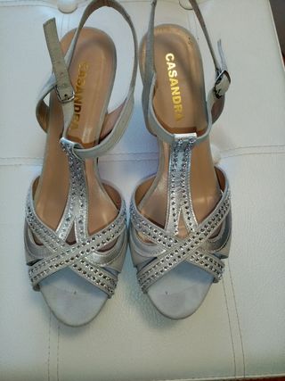 Elegantes sandalias plateadas, perfectas para eventos especiales.A pesar de su tacón, son muy cómodas por la plataforma. - Diseño con tiras finas y adornos de pedrería. Swarosky. - Tacón de altura media. - Cierre de hebilla ajustable. - Marca: Prestigio