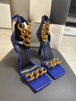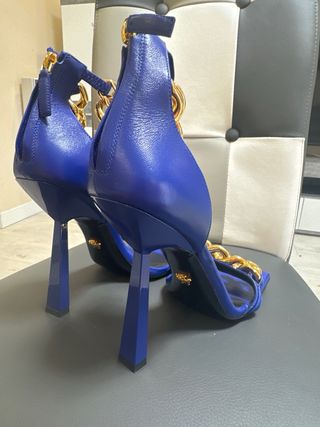 Preciosas sandalias Versace con cadena Medusa. Ideales para un look sofisticado. - Tacón alto y diseño elegante. - Cadena dorada con detalles Medusa. - Material de cuero de alta calidad. - Talla 41. - Certificado de autenticidad. - Usadas una sola vez.