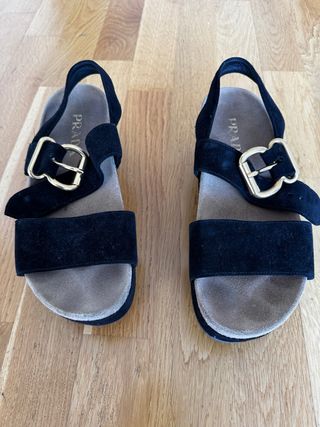 Sandalias de la marca Prada en color negro con detalles dorados.