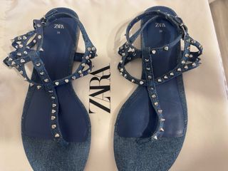 Sandalias planas de estilo gladiador con un diseño moderno. - Material exterior de denim. - Adornadas con tachuelas plateadas. - Cierre de hebilla ajustable.