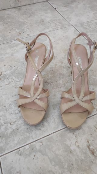 Preciosas sandalias de tacón de la marca Baldinini. Son de color beige y tienen un diseño elegante y sofisticado. -Altura del tacón: Mediano -Material: Charol -Cierre: Correa en el tobillo -En perfecto estado.