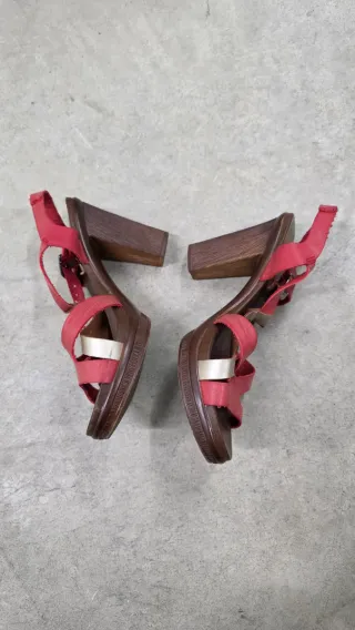 Sandalias de tacón con un diseño elegante y moderno. - Tiras cruzadas en color rojo y detalles en dorado. - Tacón de bloque. - Cierre de hebilla ajustable.