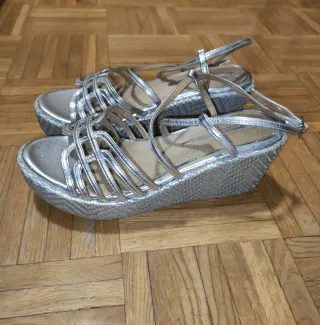 Vendo un par de sandalias de plataforma para mujer, talla 38. Ideales para el verano. Diseño de tiras cruzadas. Color plateado brillante. Suela de plataforma blanca. Hebilla de cierre. En perfecto estado. Con caja de zapatos de regalo.