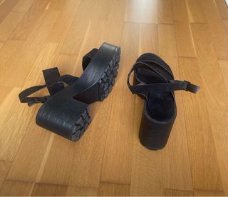 Sandalias negras con plataforma de BOSANOVA Barcelona. Tiene detalles de tiras, se abrochan con hebilla. Se encuentra en perfectas condiciones, se han usado una vez.