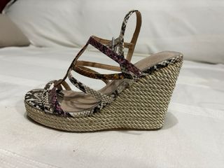 Sandalias de cuña con diseño floral y detalles de serpiente. - Material exterior: Piel y textil. - Cierre de hebilla. - Suela de esparto. Tienen algunos desgastes por el uso, pero que sólo afectan a la parte interior