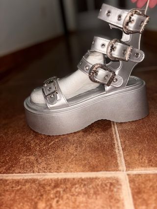 Sandalias de plataforma con un diseño gótico y detalles de hebillas. - Color plateado. - Plataforma gruesa. - Cierre con hebillas. - Estilo gladiador.