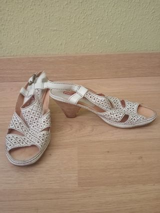 Sandalias Pikolinos de color blanco, ideales para el verano. Son de tacón pequeño y tienen un diseño elegante y sofisticado. - Diseño con perforaciones. - Hebilla de cierre en el tobillo. - Tacón de madera.