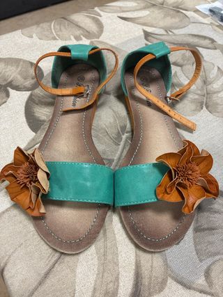 Sandalias planas con un diseño original y llamativo, perfectas para añadir un toque de estilo a tu look. - Tira delantera en color verde azulado. - Tira de tobillo y detalle de flor en color cuero. - Suela cómoda para el día a día.