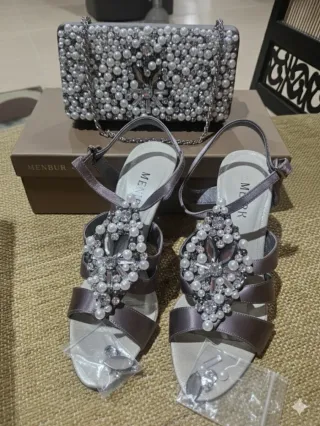 Elegante conjunto de sandalias y bolso de fiesta. - Sandalias plateadas con tiras adornadas con pedrería y perlas. - Bolso de mano plateado completamente cubierto de perlas y cristales. - Cierre de cadena para el bolso.