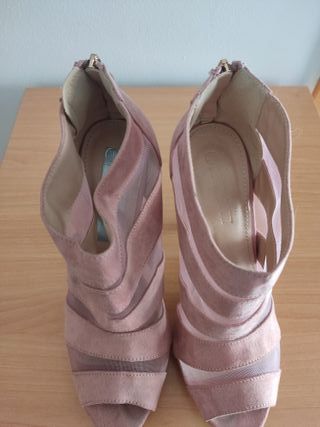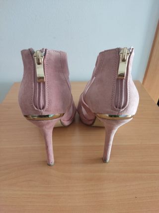 Elegantes sandalias de tacón en color rosa, con detalles de rejilla y cremallera. - Material exterior de ante. - Detalle de cremallera dorada en la parte trasera. - Adorno metálico dorado en el talón. Precio original 35.99€