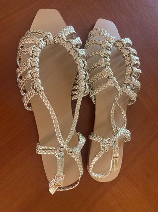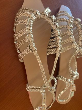 Preciosas sandalias con un diseño trenzado muy chic. - Color dorado brillante. - Talla 38 europea. ( aunque pone 39 es 38 Europa ) - Tiras finas con detalle de hebilla. - Muy bonitas y comodas.