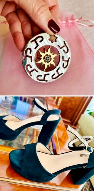 Lote de colgante de la marca Rebecca con un diseño circular, acero plateado y dorado, con motivos solares y una gema central, y sandalias de plataforma negras, efecto ante, talla 37, 11,00 cms tacón y 3,00 de plataforma