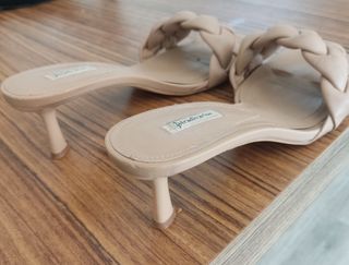 Sandalias de tacón de la marca Stradivarius, en color beige. Están en buen estado, aunque presentan algunas pequeñas marcas de uso en la suela. - Diseño trenzado. - Tacón bajo.
