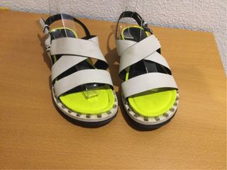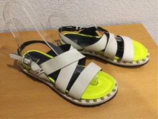 Sandalias planas con un diseño moderno y llamativo. - Tiras cruzadas en color blanco. - Suela con detalle de tachuelas niqueladas. - Plantilla interior en color amarillo neón.