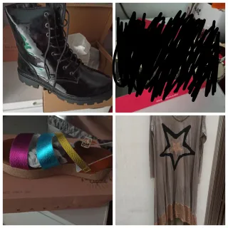 Lote de calzado variado que incluye botas y sandalias. - Botas de charol negro con cordones. - Sandalias multicolor con tiras brillantes y suela de esparto. - Vestido largo gris con estrella decorativa y lentejuelas.