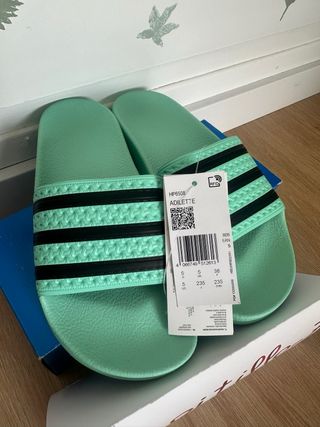 Chanclas Adidas Adilette talla 38, totalmente originales, con ticket de compra, en color verde menta y negro. - Tira ancha con las tres bandas. - Diseño cómodo y ligero.