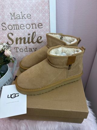Botas de la marca UGG en color beige, perfectas para el frío. - Material exterior de ante. - Forro interior de pelo sintético. - Suela de goma. - Diseño corto y cómodo.