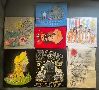 Conjunto de siete camisetas con diseños variados de la marca Pampling. Algunas sin estrenar y otras sin apenas uso. - Camiseta gris con Dumbo - Make Your Dreams Come True. - Camiseta azul con Stitch y Toothless. - Camiseta roja con los personajes de Los Increíbles. - Camiseta blanca con Muses Girls de Hércules. - Camiseta negra con Kermit y Miss Piggy inspirada en El Beso de Klimt. - Camiseta negra con Darth Vader - Come to the Dark Side y We Have Wi-Fi.