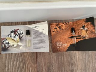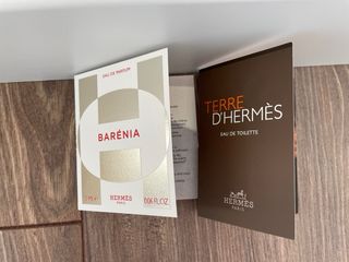 Dos muestras de fragancias icónicas de Hermes. Incluye Barenia Eau de Parfum y Terre D'Hermes Eau de Toilette. - Muestra Barenia Eau de Parfum. - Muestra Terre D'Hermes Eau de Toilette.